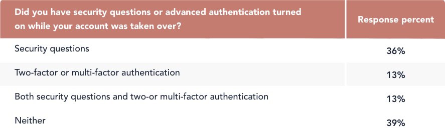 Much to our concern, 62 percent of victims already had security questions, advanced authentication, or both turned on when their accounts were taken over, indicating that these measures alone aren’t enough to prevent account takeover.