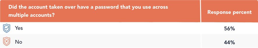 Our research indicates that the majority of account takeover victims, 56 percent, had used the same password of the affected account on other accounts, which puts those accounts at risk as well.