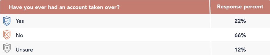 Our research found that 22 percent of U.S. adults had experienced account takeover. However, research from Sift found that number to be 25 percent, so we estimate that account takeover affects 22 to 25 percent of U.S. adults.