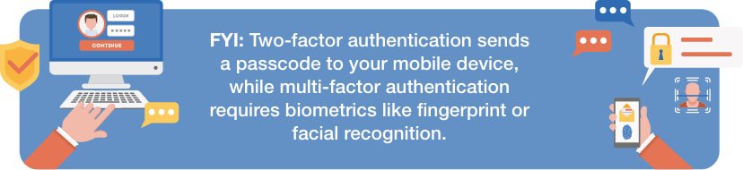 • Authentication:Additionally, you should enable two- or multi-factor authentication when it’s available. MFA requires you to do more than just enter a password – you have to enter a security code, provide biometric data, or both to access your account.
