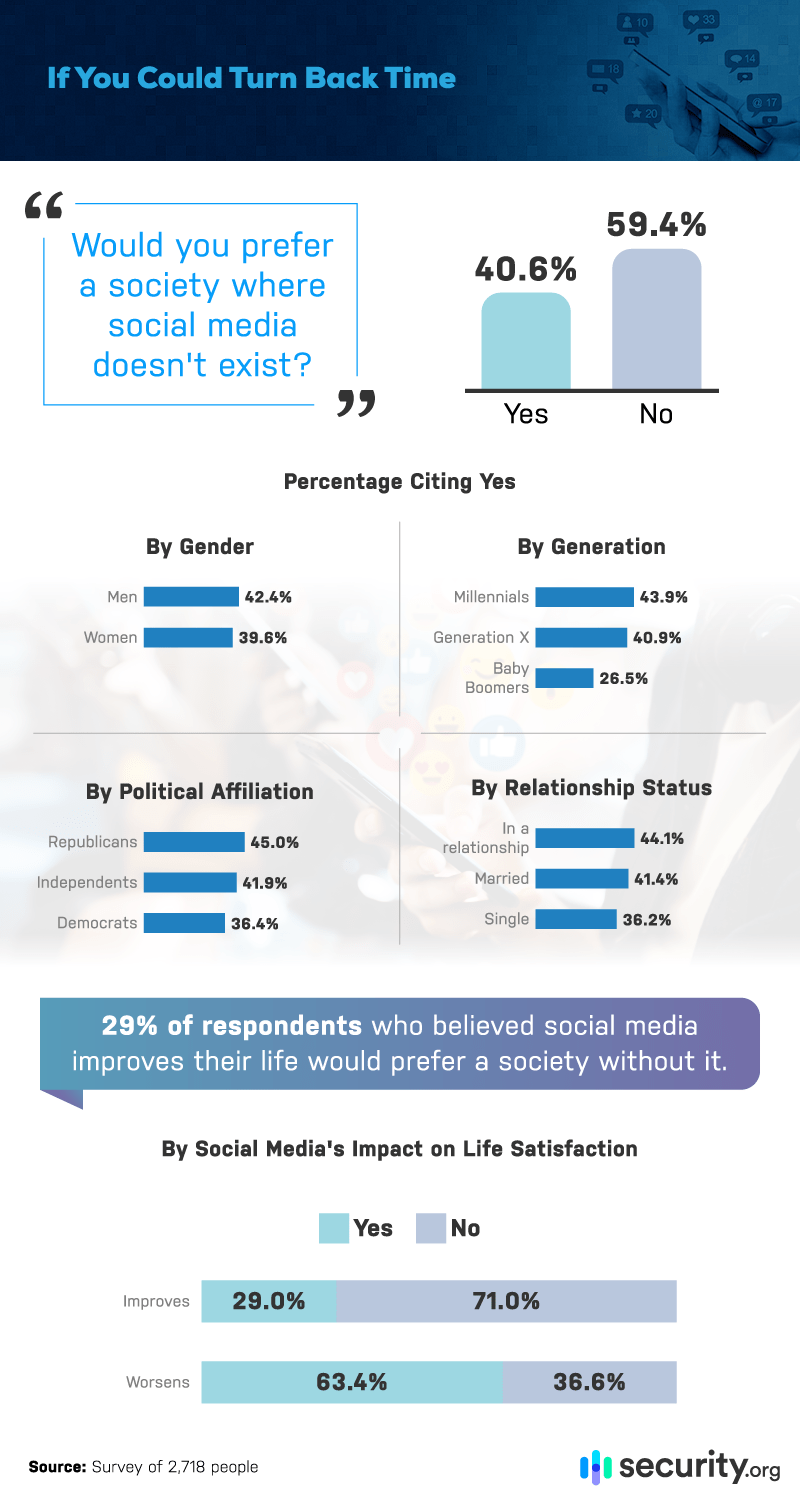 You might think the grass is greener without constant notifications, but when asked about living without social media entirely – most people weren’t ready to pull the plug. Nearly 60% of respondents said they would not prefer a society in which social media didn’t exist. Nevertheless, millennials and Republicans were the most likely to say they’d prefer a world without social media, with 43.9% and 45% saying so, respectively. People who were not in romantic relationships were least likely to report this in comparison to married people —nearly half of whom preferred a society without it.