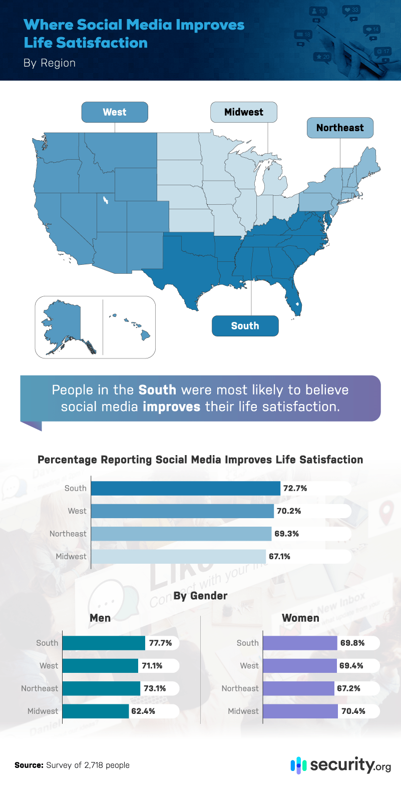 Social media’s impact varies across America’s diverse regions, reflecting different cultural attitudes and connectivity needs. Southerners topped the charts for believing social media enhanced their lives, while Midwesterners expressed the most skepticism. However, the Midwest was the only region in which women were more likely than men to think positively of social media – compared to 62.4% of Midwestern men, 70.4% of women in the Midwest said social media improved their life satisfaction.
