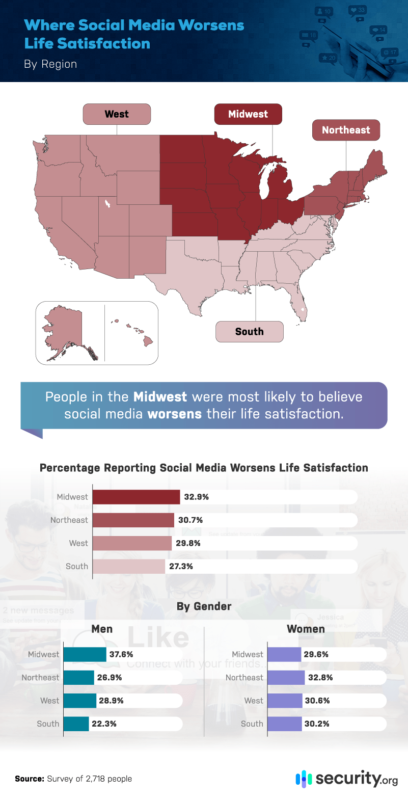 Flipping sides entirely, people from the Midwest were the most likely to say social media worsened their life satisfaction, followed by those in the Northeast. While women in the South, Northeast, and West were more likely than their male counterparts to believe social media reduced their life satisfaction, men in the Midwest were more likely to believe this (41.2%).