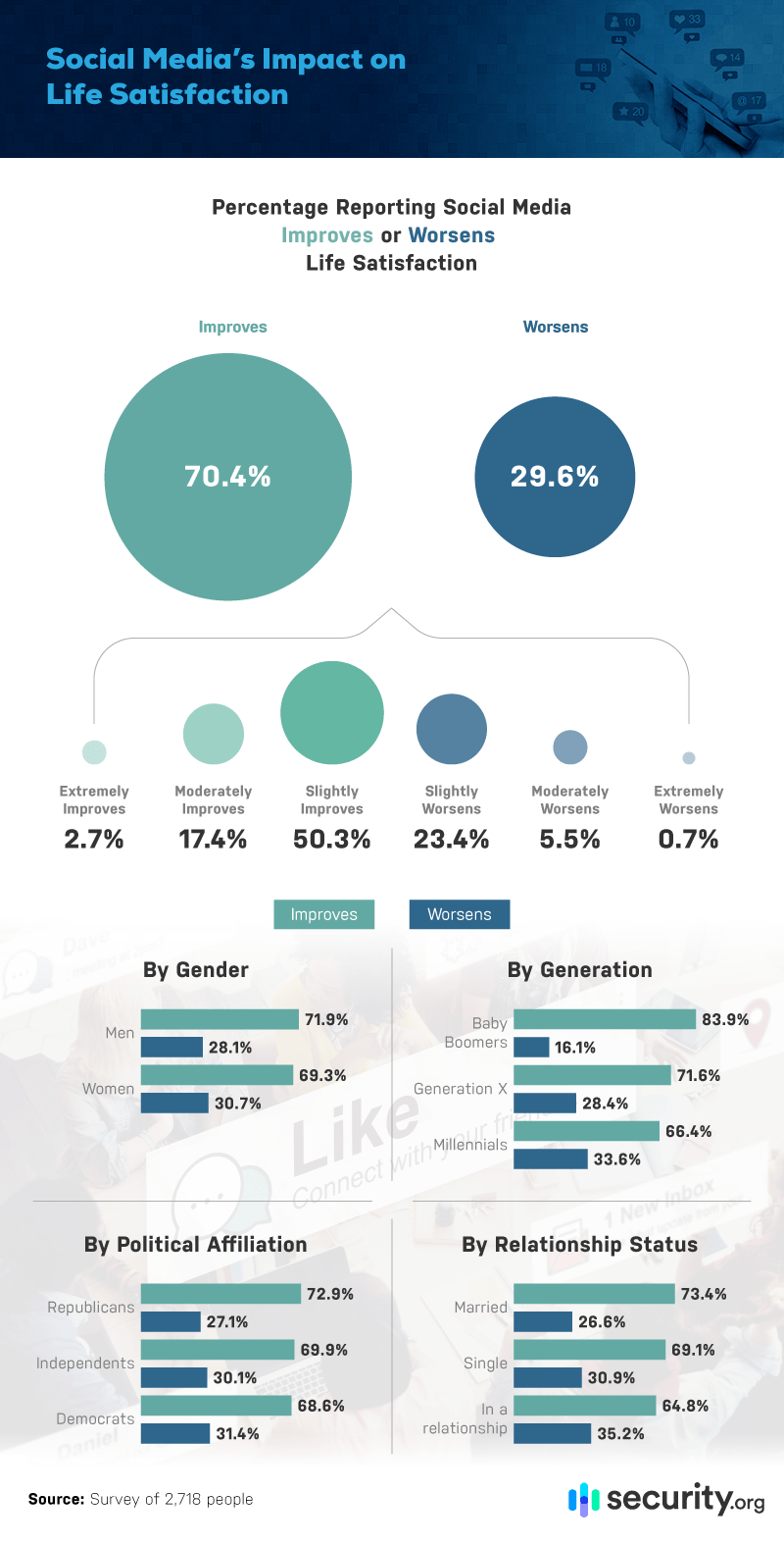 Research consistently shows that major social platforms – YouTube, Facebook, Instagram, Snapchat, and TikTok – are linked to cyberbullying, body image concerns, and FOMO (fear of missing out). They’re also associated with rising rates of depression and anxiety among However, when asked about the effects of social media, 70.4% of people said it improved their life satisfaction. But opinions – and negative consequences – weren’t equal for all.